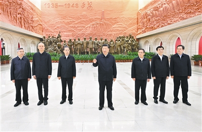 隨后,習(xí)近平等集體乘車前往延安革命紀(jì)念館,參觀《偉大歷程——中共中央在延安十三年歷史陳列》。