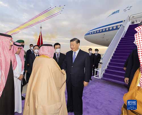 習(xí)近平乘專機(jī)抵達(dá)利雅得哈立德國王機(jī)場時,受到沙方隆重?zé)崃覛g迎。機(jī)場鳴放21響禮炮,禮賓護(hù)衛(wèi)機(jī)在空中拉出象征中國國旗的紅黃兩色彩帶。禮兵分列紫地毯兩側(cè),中沙兩國國旗迎風(fēng)飄揚(yáng)。沙特利雅得省省長費(fèi)薩爾親王、外交大臣費(fèi)薩爾親王、中國事務(wù)大臣魯梅延等王室重要成員和政府高級官員熱情迎接。