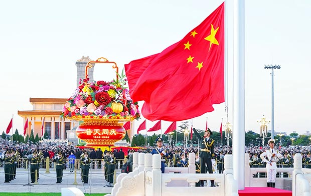 今年的10月1日,是中華人民共和國(guó)成立75周年紀(jì)念日,中科投資干部職工代表在臨晨到天安門廣場(chǎng)觀看升國(guó)旗儀式,歡度國(guó)慶節(jié)。 1日臨晨,天還沒(méi)亮,中科投資的干部職工代表就趕往天安門廣場(chǎng),希望獲得一個(gè)觀看升旗的好位置。我們的手里都是拿著五星紅旗,統(tǒng)一衣服在左上角貼著紅心國(guó)旗圖標(biāo),口罩上也印有國(guó)旗圖案。我們看到不少游客也早早來(lái)到廣場(chǎng),手里也拿著五星紅旗,還有很多人的衣服和口罩上也印有國(guó)旗圖像。 國(guó)慶節(jié)當(dāng)天,天安門廣場(chǎng)裝扮一新。晨光在天邊隱隱浮現(xiàn),華燈照耀下,在這個(gè)新中國(guó)成立75周年的國(guó)慶日,天安門廣場(chǎng)猶如巨幅畫(huà)卷。人民英雄紀(jì)念碑以北,是高達(dá)18米的“祝福祖國(guó)”巨型花果籃?;@體南側(cè)書(shū)寫(xiě)“祝福祖國(guó)”“1949-2024”字樣。6時(shí)06分,天安門城樓下,護(hù)旗編隊(duì)鏗鏘行進(jìn)。20萬(wàn)名群眾簇?fù)碓趶V場(chǎng)及周圍,靜待五星紅旗升起。 6時(shí)10分,全場(chǎng)肅靜。“向——國(guó)旗——敬禮!” 莊嚴(yán)的《義勇軍進(jìn)行曲》響起,這場(chǎng)隆重的儀式由中國(guó)人民解放軍儀仗隊(duì)在軍樂(lè)團(tuán)的伴奏下舉行。迎著清晨的第一縷陽(yáng)光,雄壯的國(guó)歌聲響徹天安門廣場(chǎng),鮮艷的五星紅旗與太陽(yáng)一同升起?,F(xiàn)場(chǎng)一雙雙熱辣辣、情切切的眼睛以莊嚴(yán)的注目禮致敬國(guó)旗,我們一起來(lái)觀看升旗的轉(zhuǎn)業(yè)退伍軍人們,莊嚴(yán)的舉起右手向國(guó)旗敬禮。隨著國(guó)歌響起,五星紅旗緩緩升起,我們的心情隨之澎湃,激動(dòng)的心隨著國(guó)旗沸騰。激動(dòng)的淚花在眼中閃耀。高高飄揚(yáng)的五星紅旗,凝聚著億萬(wàn)人民的心,我們充滿蓬勃力量,共同為祖國(guó)祝福,生日快樂(lè)! “起來(lái),不遠(yuǎn)做奴隸的人們,把我們的血肉筑成新的長(zhǎng)城……”聽(tīng)著那鏗鏘有力的國(guó)歌,望著那隨風(fēng)而起五星紅旗,心中那深深的愛(ài)國(guó)情懷油然而生,腦海中仿佛浮現(xiàn)出1949年新中國(guó)成立的那普天同慶的歡樂(lè)景象。國(guó)歌響起來(lái)了,這是令人振奮的歌曲“義勇軍進(jìn)行曲”,多么雄渾多么富有氣勢(shì)的一首歌曲。我永遠(yuǎn)不會(huì)忘記自己祖國(guó)國(guó)旗的顏色,我愛(ài)你中華民族共和國(guó),你是我們共同的家園。國(guó)旗下,新的壯美畫(huà)卷正在展開(kāi)……我們觀看的不只是一面國(guó)旗,更是一個(gè)民族的頑強(qiáng)與堅(jiān)韌。祝福我們的祖國(guó)更加強(qiáng)大,它能讓愛(ài)國(guó)的激情在每一個(gè)中國(guó)人的心中燃起。 |