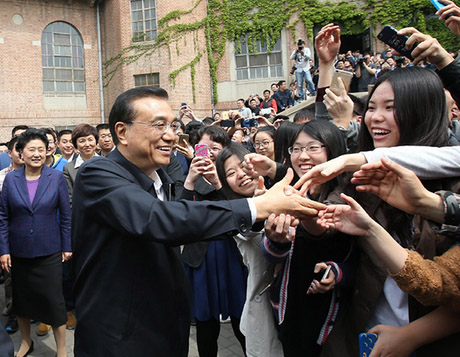 新華網(wǎng)北京4月15日電 李克強(qiáng)15日上午考察清華大學(xué)??偫硐群笤谛J佛^參觀清華發(fā)展歷程和重大科技成果展,在建筑學(xué)院與白發(fā)老教授和學(xué)生交流,在生命科學(xué)學(xué)院蛋白質(zhì)設(shè)施實驗技術(shù)中心看望年輕科研團(tuán)隊,并來到清華大學(xué)圖書館,聽取“清華簡”最新研究成果情況匯報,在閱覽室與學(xué)生座談互動。(新華社“新華視點”微博報道) |