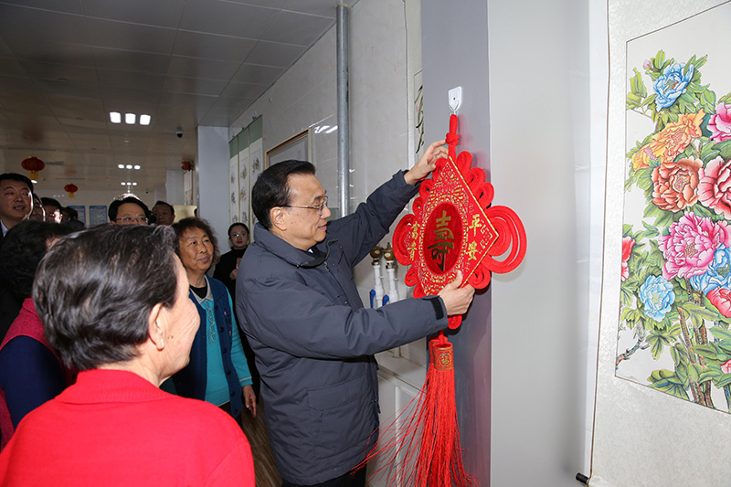 2月13日春節(jié)前夕,李克強來到吉林省白城市鎮(zhèn)賚縣社會福利院,專程看望慰問老年人??偫斫o老人們帶來過年穿的新棉衣等年貨,并親手把兩個“?!薄皦邸敝袊Y掛在墻上??偫碚f,孝敬老人是我們祖祖輩輩的傳統(tǒng)。你們都曾為社會做出自己的貢獻,現(xiàn)在年紀大了,全社會都會惦著你們。得知許多老人已經(jīng)80歲甚至90高齡了,總理說,現(xiàn)在社會上流行叫你們“80”后、“90”后,說明未來還長,好日子等著你們呢! |
