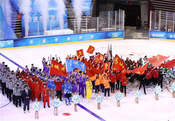 開幕式以“暢享冰雪、揮灑激情、共圓冬夢、相約北京”為主題。在旋律昂揚(yáng)的進(jìn)行曲中,裁判員隊伍,全市各運(yùn)動員代表隊依次入場,健兒們精神飽滿,以各具特色的形式展現(xiàn)了本市冰雪運(yùn)動的蓬勃發(fā)展。北京市青少年花樣滑冰運(yùn)動員安香怡、冰球高級教練員姚乃峰和短道速滑國家級裁判員姜宏分別代表運(yùn)動員、教練員、裁判員宣誓。在體育展演環(huán)節(jié),三幕主題秀既展示了本市冰雪運(yùn)動的發(fā)展歷史,以及申冬奧成功后在冰雪運(yùn)動推廣方面所取得的成就,也表達(dá)了市民對冰雪運(yùn)動的熱愛和對冬奧會的美好期盼。運(yùn)動員、教練員、裁判員宣誓后,我公司運(yùn)動員代表隊同近4000名觀眾一起欣賞了精彩紛呈、美輪美奐的冰上體育展演。來自海淀區(qū)和西城區(qū)的兩支U15男子冰球隊聯(lián)袂呈現(xiàn)了一場表演賽,冰球小將們技藝精湛、對抗激烈,博得觀眾的陣陣掌聲和歡呼,讓大家充分領(lǐng)略了北京冰雪運(yùn)動發(fā)展的生機(jī)活力、全民支持奧運(yùn)的熱情。