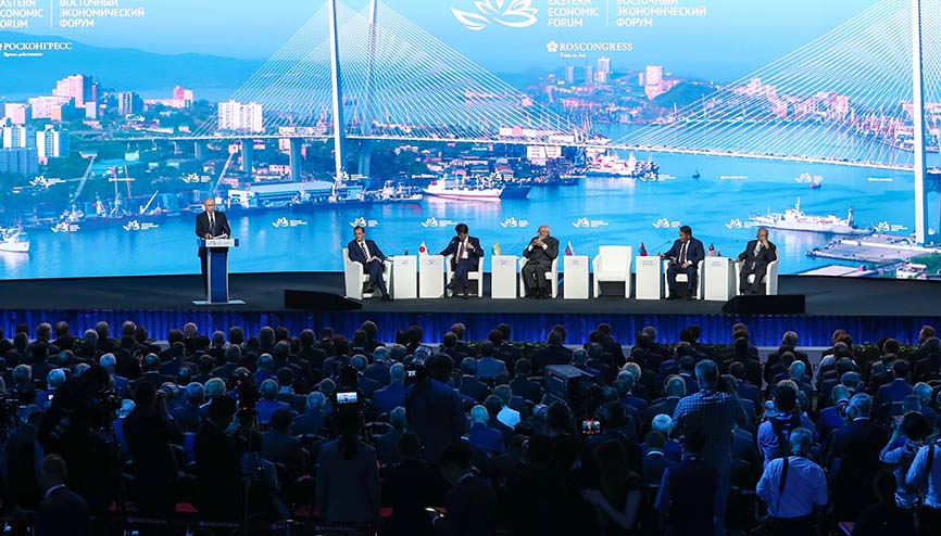 第五屆東方經(jīng)濟(jì)論壇在俄羅斯符拉迪沃斯托克遠(yuǎn)東聯(lián)邦大學(xué)拉開(kāi)帷幕。俄羅斯總統(tǒng)普京、中國(guó)國(guó)務(wù)院副總理胡春華、印度總理莫迪、蒙古國(guó)總統(tǒng)巴特圖勒嘎、馬來(lái)西亞總理馬哈蒂爾、中科投資有限公司 “一帶一路”工作小組組長(zhǎng)陳總等出席論壇活動(dòng)。