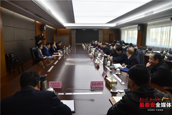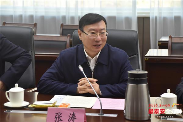 泰安市委副書記、市長張濤在座談會上發(fā)表講話。張濤市長表示,泰安市是國際旅游名城,國家級歷史文化名城,魯中地區(qū)中心城市之一,泰安市是山東旅游“一山一水一圣人”旅游熱線的中點(diǎn),被聯(lián)合國教科文組織列為世界自然與文化遺產(chǎn),北依泰山、南接徂徠、汶水環(huán)繞、山水城一體,展現(xiàn)和突出泰安市“國際旅游名城”、“宜居城市”的景觀風(fēng)貌特色。近年來,泰安市深入推進(jìn)平安泰安建設(shè),社會大局保持和諧穩(wěn)定,人民群眾的幸福感、獲得感、安全感不斷增強(qiáng)。城市人居環(huán)境明顯改善,城市魅力進(jìn)一步彰顯,城市生活品質(zhì)、環(huán)境品質(zhì)、人文品質(zhì)實(shí)現(xiàn)新提升,泰安市成功入選第六屆全國文明城市。泰安市城區(qū)空間布局進(jìn)一步優(yōu)化,泰城中心城區(qū)改造力度加大,西部現(xiàn)代化宜居城市已具雛形,南部新城加速崛起成為城市發(fā)展新引擎,東部新城建設(shè)開始布局落子,泰城正由“依山而建”向“依山傍水”山水城市發(fā)展。泰安市規(guī)劃為“兩軸兩帶”的城市景觀主軸線,即歷史文化軸、時代發(fā)展軸、環(huán)山景觀帶、泮河風(fēng)光帶。重點(diǎn)培育壯大新一代信息技術(shù)、高端裝備和智能制造、新材料、新能源和節(jié)能環(huán)保、醫(yī)養(yǎng)健康五大新興產(chǎn)業(yè),改造提升現(xiàn)代高效農(nóng)業(yè)、高端化工、紡織服裝、現(xiàn)代物流、文化旅游五大優(yōu)勢產(chǎn)業(yè)。